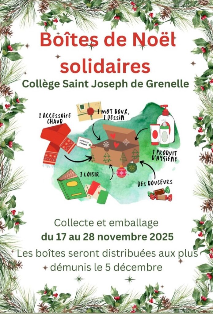 Comme l’an dernier, les collégiens (et professeurs et institutrices) se sont massivement investis pour préparer des boîtes solidaires pour les personnes de la rue : objet chaud (gants, écharpe, bonnet, chaussettes), produit d’hygiène, objet de loisir (cartes, mots croisés, livres, petits jeux), et douceur de Noël, sans oublier une carte, ont été emballés avec coeur dans des boîtes à chaussures customisées pour l’occasion. Bravo à chacun pour son implication dans ce projet pour aider les plus pauvres ! « Ce que vous avez fait à l’un de ces petits qui sont mes frères, c’est à moi que vous l’avez fait », dit Jésus dans l’évangile de Matthieu.